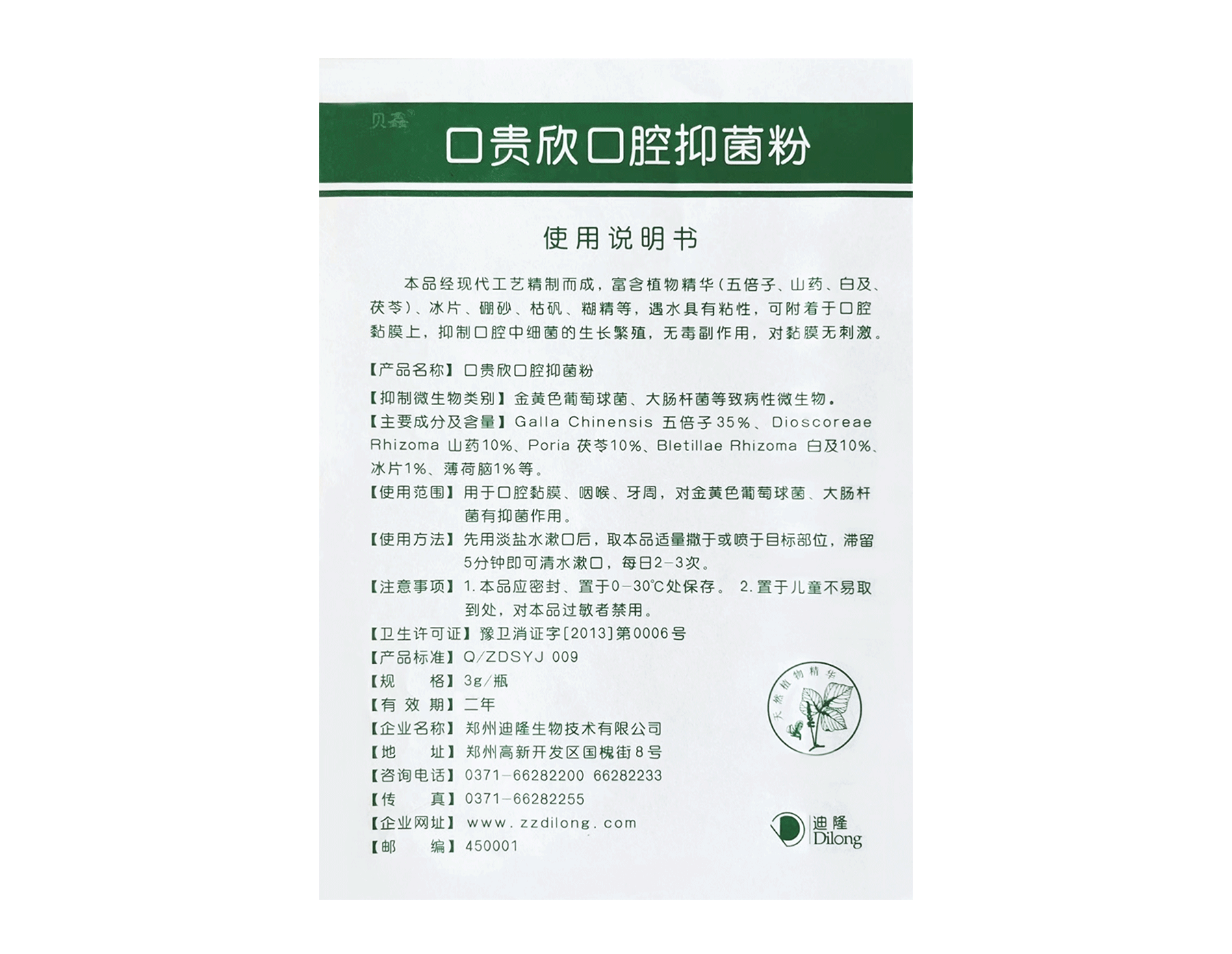 用于口腔黏膜、咽喉、牙周,對金黃色葡萄球菌、大腸桿菌有抑菌作用。